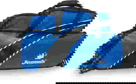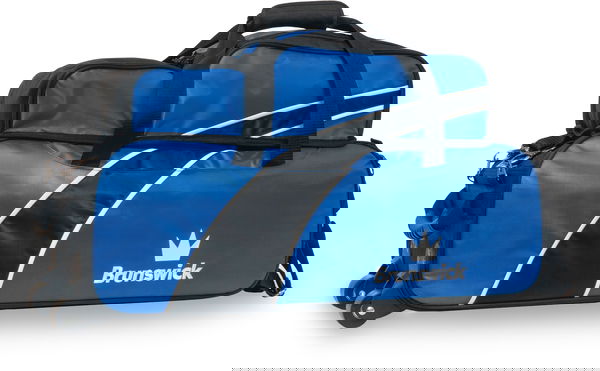 Brunswick Edge Triple Rolling Tote with Shoe Pouch Blue The Brunswick Edge Triple Rolling Tote with Shoe Pouch securely transports three balls with foam ball holders with a convenient transparent top view. This bag features a rubber pull handle for comfort, small accessory pocket on the front side, and removable shoe and accessory pouch!