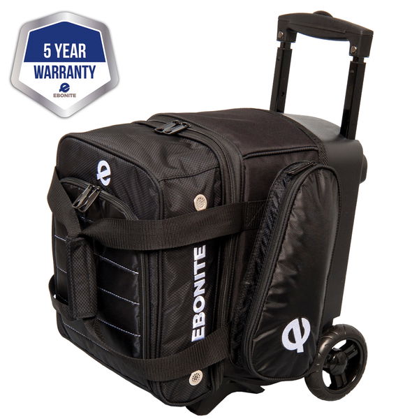 Eclipse the competition with this great single ball roller from Ebonite. The Ebonite Eclipse Single Roller bowling bag is made of durable 600D fabric, it can hold one bowling ball along with shoes up to a men's size 13, and plenty of accessories. This fun bag has added style with color coordinated handles and wheels!